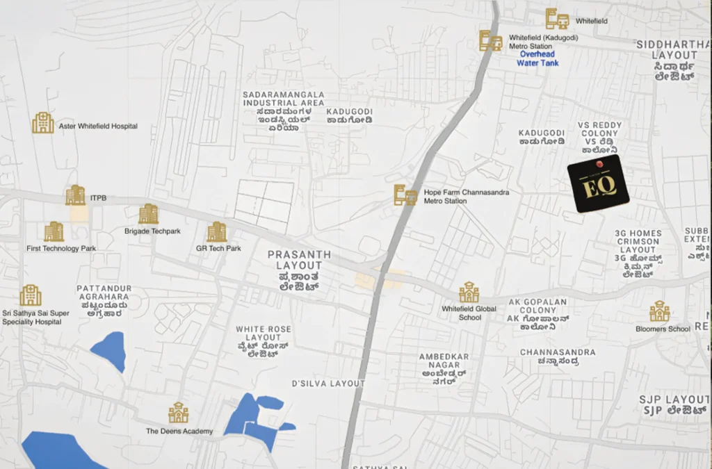 The location of DSR Codename EQ further amplifies its appeal. Situated in Whitefield’s prime corridor, it offers unparalleled connectivity to major IT parks, business zones, educational institutions, healthcare centers, and entertainment hubs. Key destinations such as ITPL, Forum Shantiniketan, Phoenix Marketcity, and Outer Ring Road are all within easy reach, ensuring that work, leisure, and lifestyle are always just minutes away.
